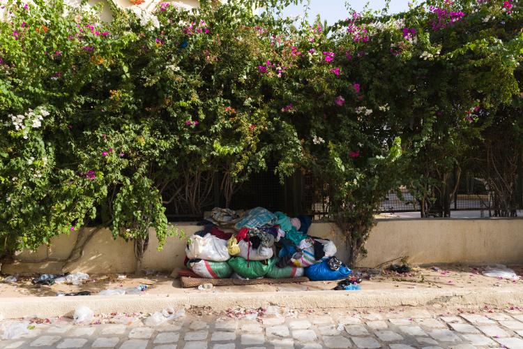 Arrivé au centre de Sfax, au rond point Bourguiba, à quelques pas de la mosquée El Manar, avenue d’Algérie, j’aperçois des hommes et des femmes presque invisibles, cachés par des sacs de plastique et des branches d’arbres… De suite en prise avec la réalité que vivent aujourd’hui les migrants subsahariens en attendant la traversée vers l’Europe, l’Italie est à moins de 400 km par la mer. Là, le temps de faire 2 photos, voila qu’un un agent des forces de police me demande si j’ai l’autorisation officielle, si je suis journaliste… S’en suit un contrôle de passeport, un contrôle de 3 heures avec à la sortie une escorte policière toute la journée.