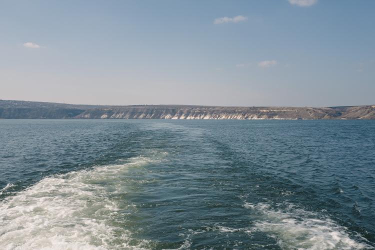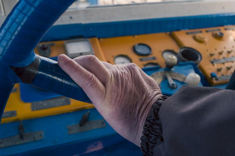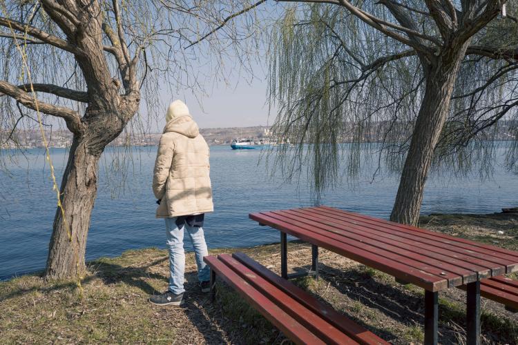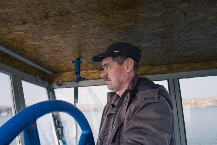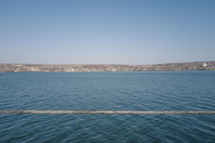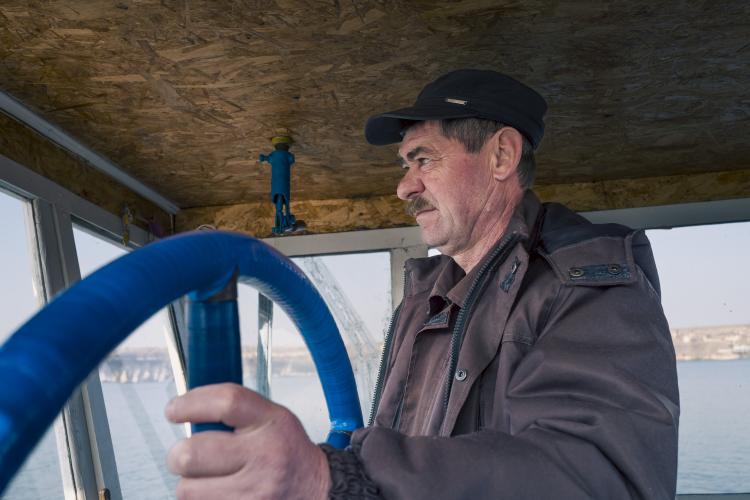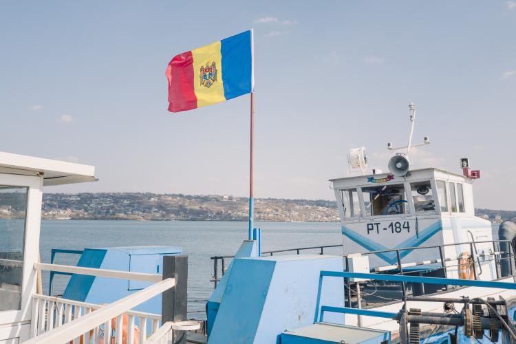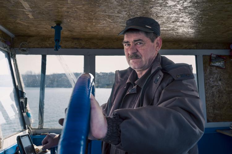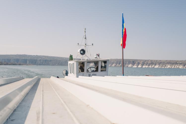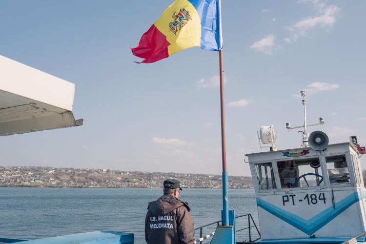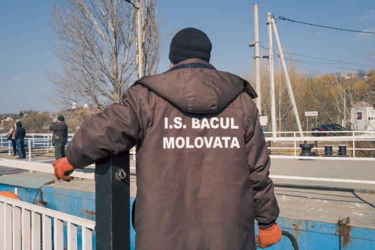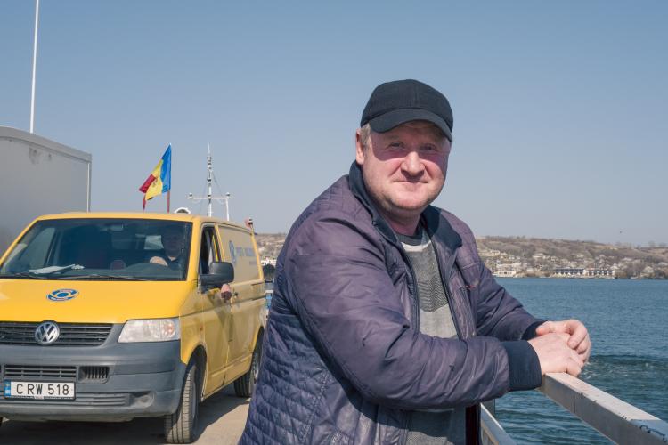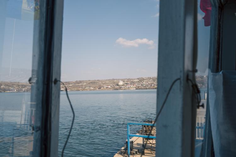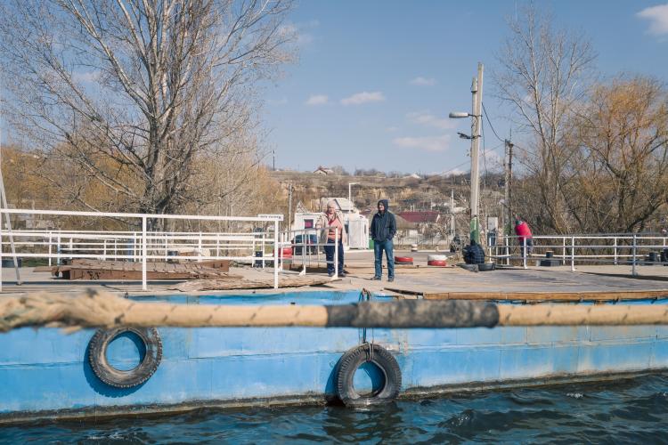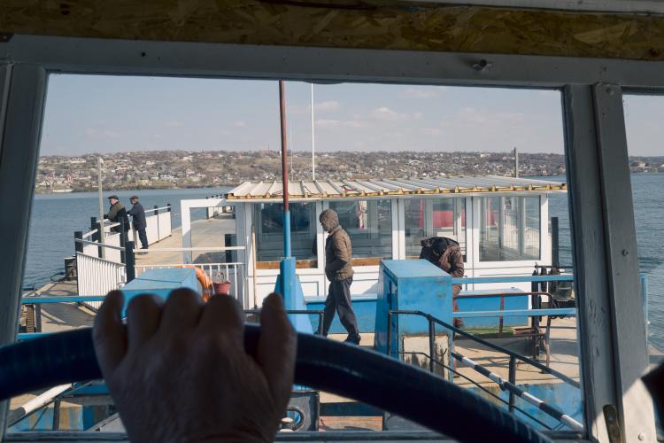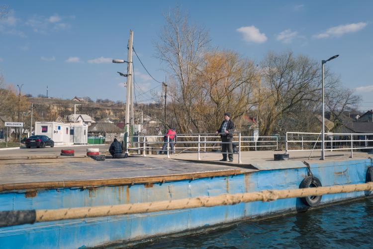 Traversee du Dniestr (ou Nistru), fleuve essentiel qui traverse la Moldavie et separe la Bessarabie de la Transnistrie, region de Moldavie qui a fait secession et s est autoproclame en Republique independante, non reconnue a l ONU, depuis la dislocation de l URSS en 1991 et une guerre civile jusqu en 1992, plus de 3000 morts, et qui se trouve depuis au cœur des relations entre la Moldavie et la Russie. Le passage est gratuit, le Nistru est gere par la Transnistrie, le bac embarque aujourd’hui 8 voitures et leurs passagers. Amarres larguees, en avant pour une traversee de 8 minutes de Molovata Noua a Molovata de l autre cote du fleuve. Moldavie, Molovata le 04 mars 2024.