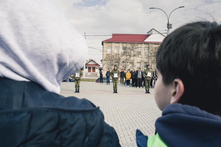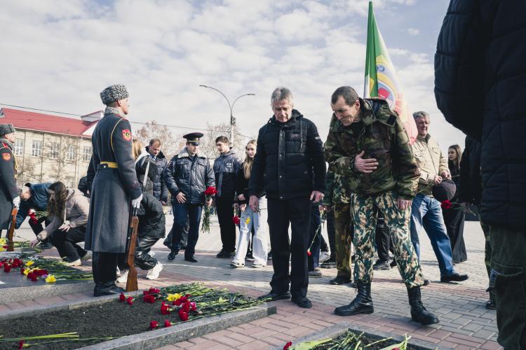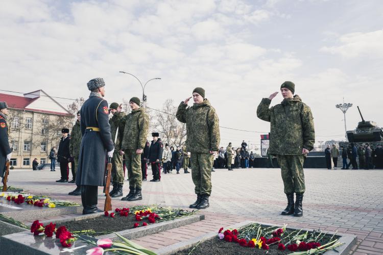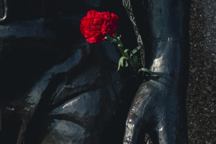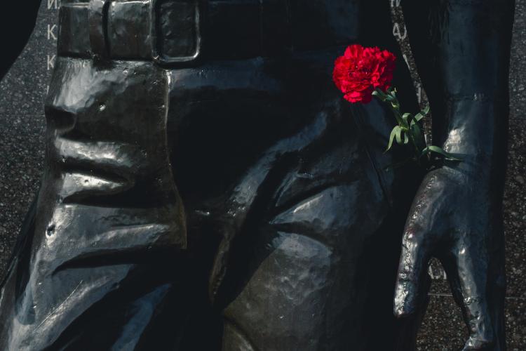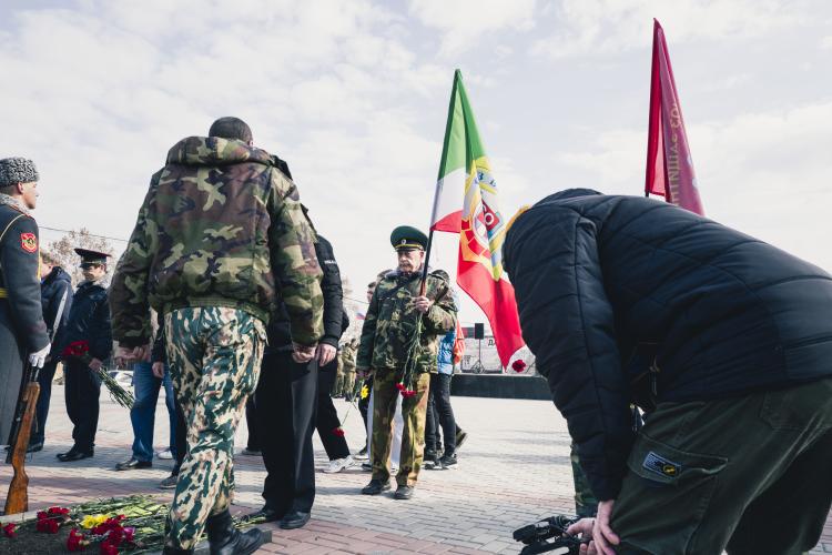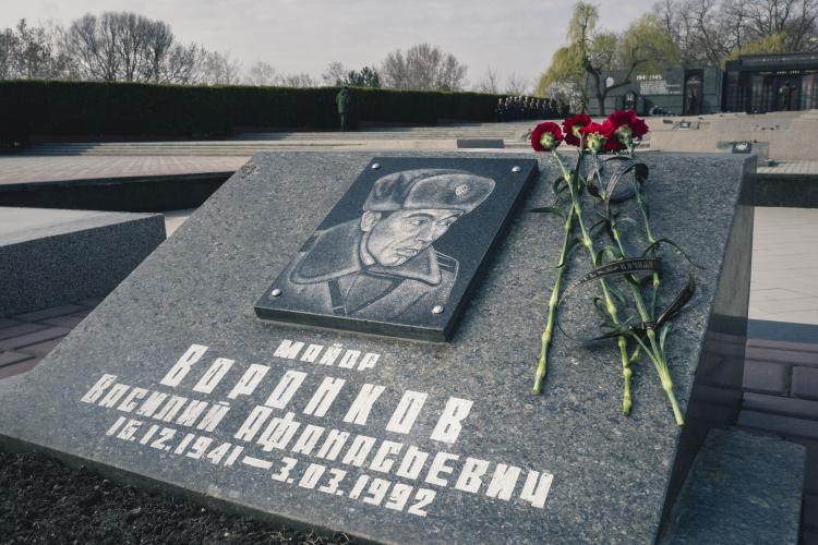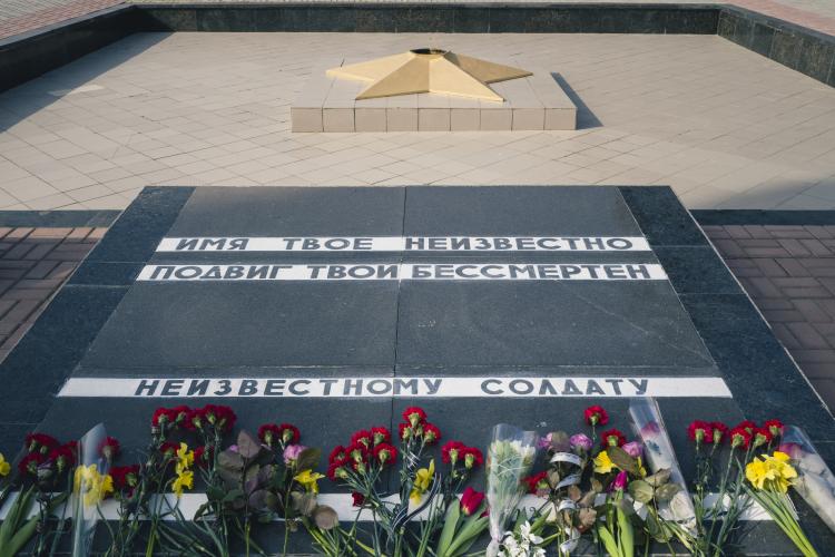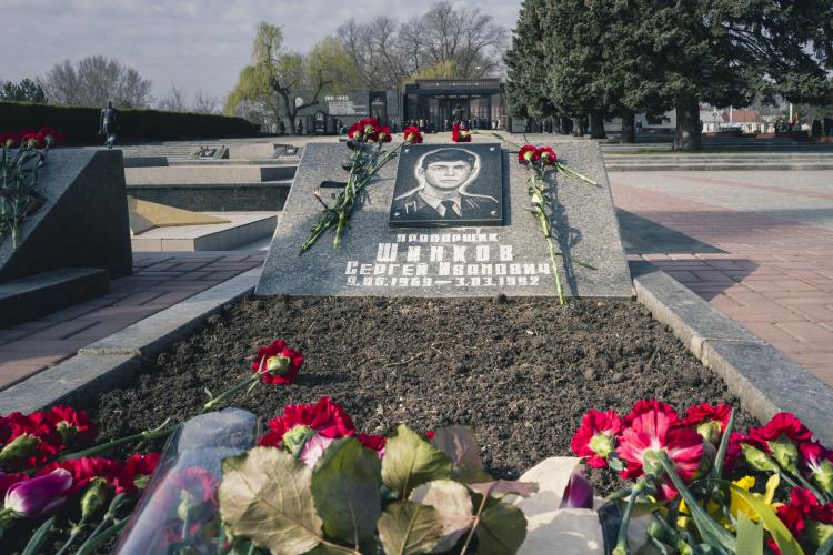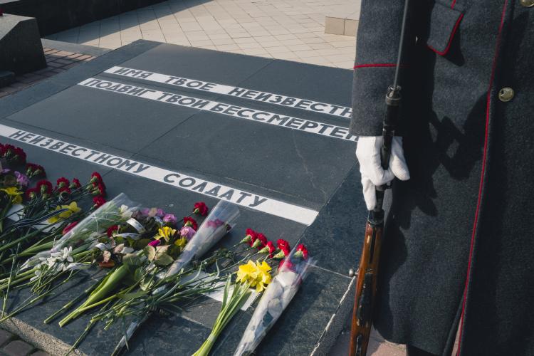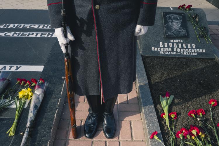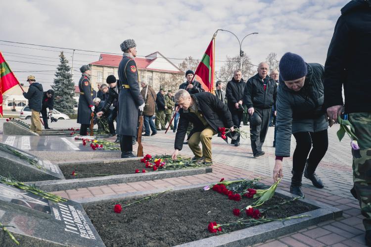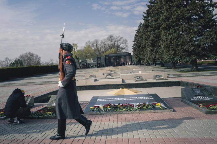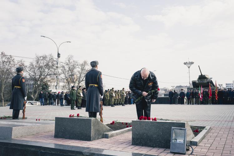 Ceremonie de souvenirs et commemoration au Memorial de la guerre civile de 1990-1992 avec la Moldovie et a la guerre de 1941-1945. Depot d oeillets rouges et jonquilles sur les Steles des combattants de la guerre 1990-1992, ainsi que sur le Memorial 1941-1945. Transnistrie, Tiraspol le 3 mars 2024.