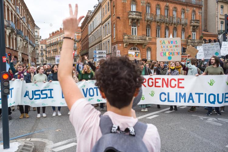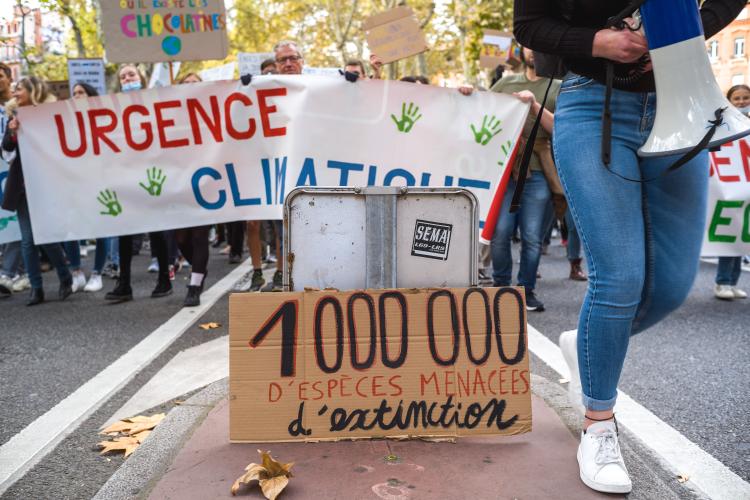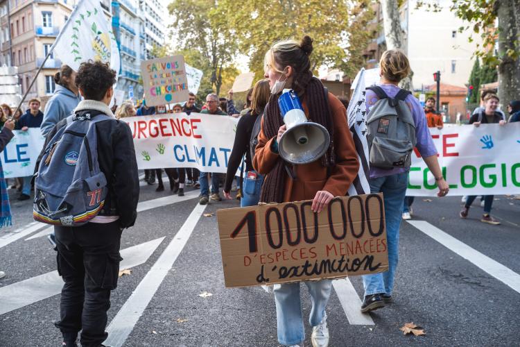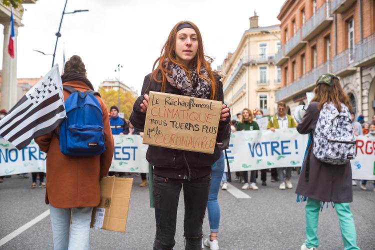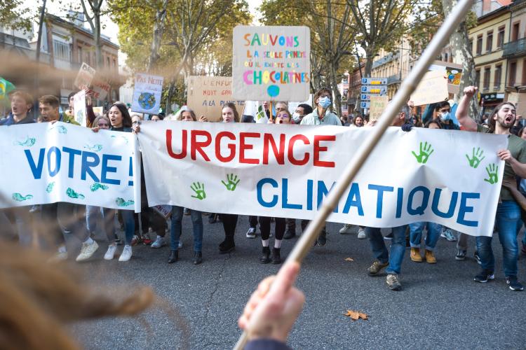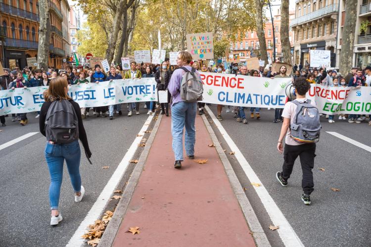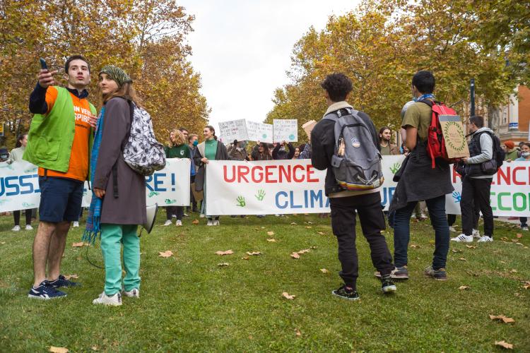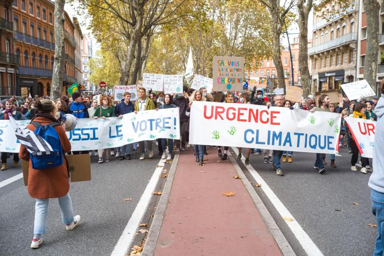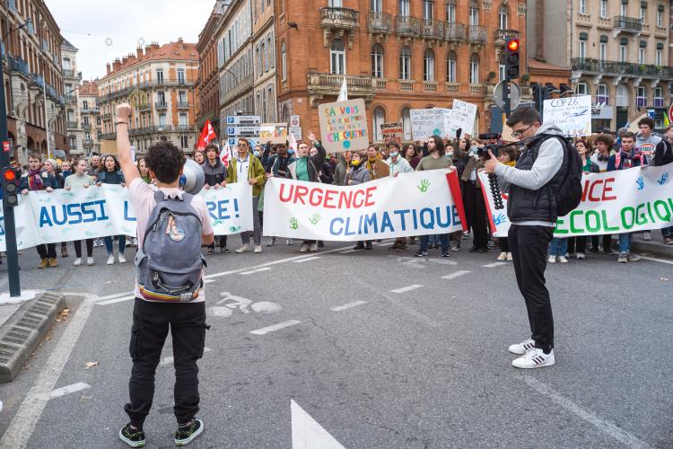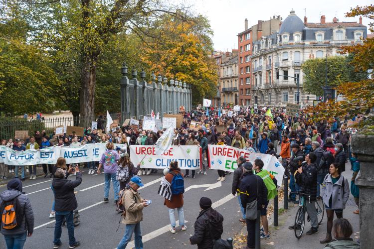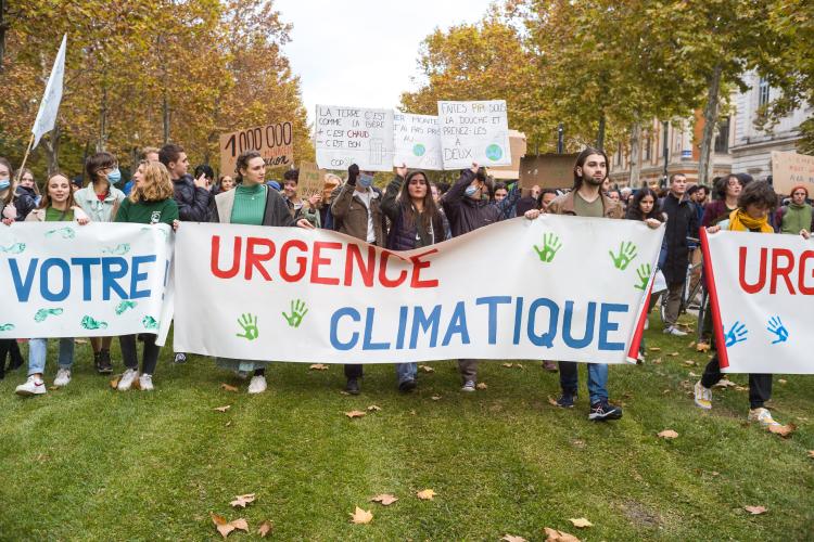 Journee mondiale d action, marche reunissant plusieurs collectifs dont Alternatiba, ANV-COP21, Greenpeace Toulouse, Youth For Climate, Extinction Rebellion, Axe Vert de la Ramee, FNE Midi-Pyrenees, CCFD Terre Solidaire Midi-Pyrenees, Collectif Anti OGM 31, Les Amis de la Terre, Stop TERRA 2. Le dereglement climatique, c est notre present a toutes et tous, partout dans le monde. Phenomene global, il appelle des reponses mondiales pour lutter ensemble. Six ans apres l accord de Paris, c est ce qui devrait guider les Etats a l occasion de la COP26 qui se deroulera a Glasgow du 31 octobre au 12 novembre afin de maintenir la hausse des temperatures en dessous de la barre des 2°C, voire 1,5°C.  France, Toulouse, 2021-11-06