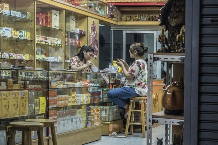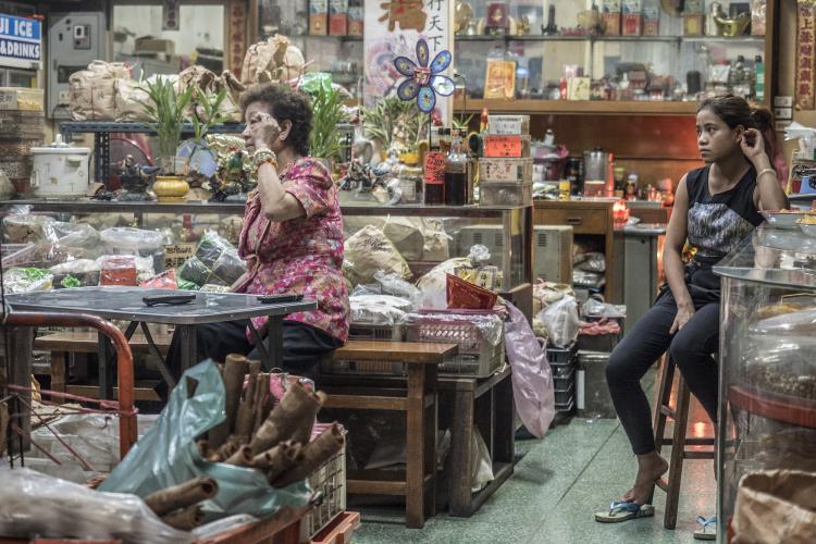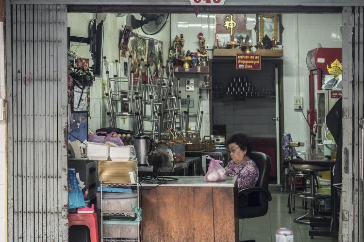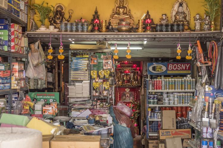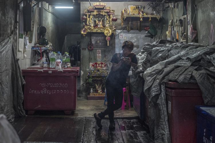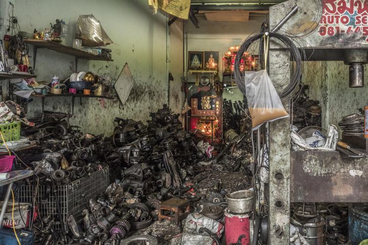 population, à tout le moins pour la jeune génération, mais qu’ils étaient sans doute pris dans le piège de la manne économique que représente l’occidental en quête d’atypisme. Ma série vise à révéler cette ambivalence : attraction d’un univers authentique, maintien artificiel de cette authenticité (au péril de la santé des habitants) pour des raisons pécuniaires. Car si l’on observe Bangkok dans sa globalité, on note rapidement qu’elle a toutes les caractéristiques d’une mégalopole du 21e siècle et que ce quartier est resté figé dans le passé. Après plusieurs semaines, habitués à mon passage quotidien, les habitants ont accepté que je les photographie sans mise en scène ou bien juste celle offerte naturellement par leur boutique.