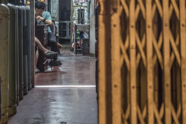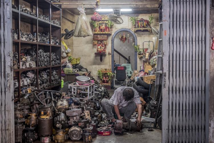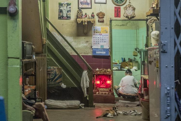 J’ai habité et travaillé dans le quartier chinois pendant 2 mois. Mon trajet logement-atelier me faisait fouler, plusieurs fois par jour, ces rues typiques où les ateliers-maisons se succèdent dans un alignement sans fin ; de petites échoppes mono-produit et très souvent tournées vers la mécanique. Chaque atelier-maison est constituée de la même façon : un étroit magasin en rez-de-chaussée intégralement ouvert sur la rue, au fond une cuisine rudimentaire, une douche et aux étages des dortoirs, installés de façon temporaire, mais permanent. Ainsi, ces familles commerçants travaillent et vivent littéralement sous le nez des passants. La frontière entre sphères publique et privée est totalement effacée. Ils se livrent tel un spectacle dont leur atelier en est la scène. Et c’est bien cela qui m’a questionné. Vivre de cette façon est-ce réellement une nécessité ? Il est a noter que ces bâtiments sont pour la plupart insalubres, rongés par l’humidité (mousson) et générateurs de nombreuses maladies. Malgré tout, le quartier reçoit un flot incessant de touristes curieux d’un folklore endémique. Au fil des semaines, j’ai pu déceler qu’un autre choix était possible pour cette